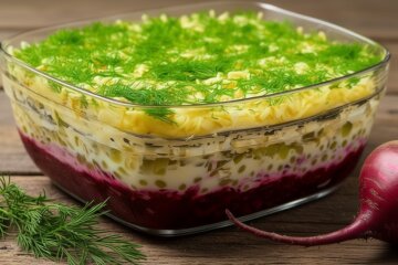Именно таким и стал салат "Скромница". Он напоминает классические "Шубу" и "Мимозу", но выигрывает лёгкостью, нежностью и пикантной чесночной заправкой. Бюджетный по составу, он выглядит и ощущается празднично — а значит, идеально подходит для встречи года Коня.
