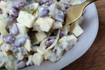 Он не претендует на кулинарную революцию, но умеет делать праздник простым и вкусным. Сочетание: солёная сельдь, нежные яйца, хрустящие огурцы, немного лука, мягкая консервированная фасоль — и щепотка перца, чуть майонеза. Всё. Быстро, без заморочек, но с характером.