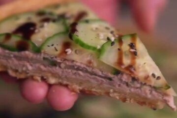 Собираем киш. Готовую основу аккуратно переверните (это даёт хруст!), выложите слой тунца с сыром, добавьте свежий огурец и красный лук, посыпьте кунжутом и полейте бальзамическим соусом.