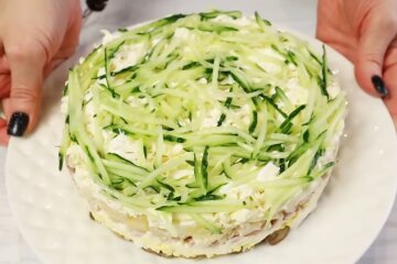 Нарежь огурец тонкими брусочками и укрась ими верх салата — это добавит свежести и декоративности.