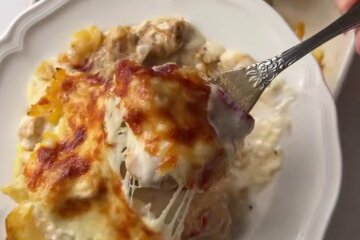 Основу складають звичні продукти: картопля, куряча грудка, цибуля та болгарський перець. Все поєднує вершковий соус бешамель і моцарелла, що тягнеться, яка перетворює звичайну вечерю на маленьке свято.