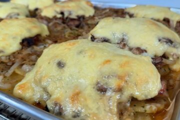 Справжній зоряний вихід — це м'ясо французькою: соковито, ароматно, під хрумкою сирною скоринкою і з легкими грибними нотками, як робили наші мами на Новий рік.