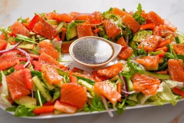 Цей рецепт — саме з таких. Салат з лососем, свіжими овочами та легкою заправкою не перевантажує смак, добре виглядає на святковому столі і однаково доречний і новорічної ночі, і різдвяної вечері. Перевірено: гості не просто з'їдають все до останнього листка салату, а й обов'язково просять рецепт з детальною деталізацією.