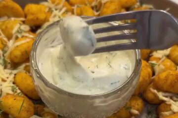 Поки ньокки підрум'янюються, збирають соус. У невеликій мисці з'єднують майонез, сметану та гірчицю, додають дрібно нарізаний кріп і ретельно розмішують до однорідності. Соус виходить ніжним, з легкою пікантною ноткою та свіжим трав'яним акцентом.