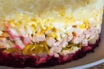 - Перед тим як зняти кільце, можна акуратно прогріти салат у холодильнику 10 хвилин - тоді шари "зійдуть" візуально краще і він трохи щільніше тримати форму.